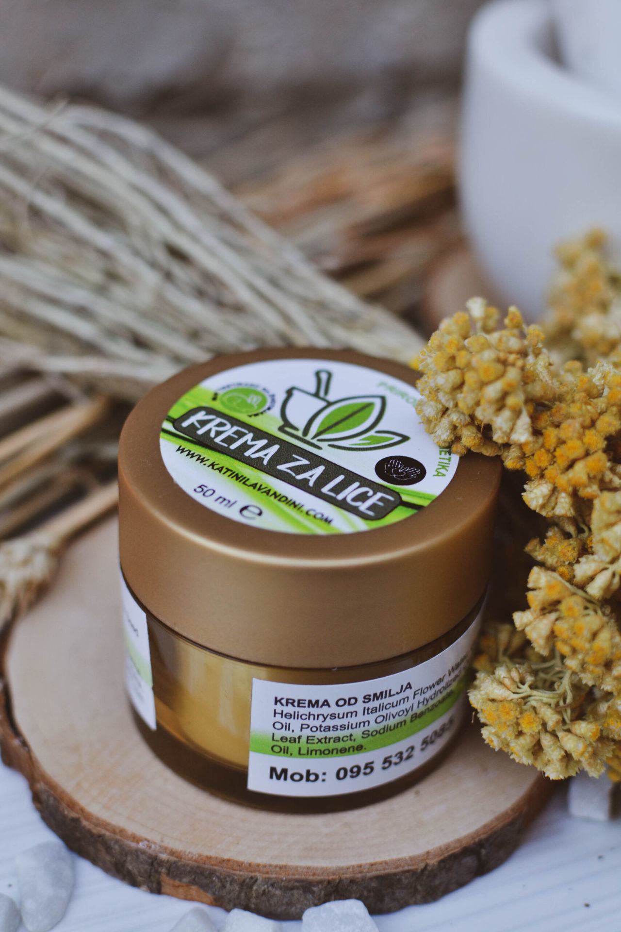 Naš najbolji proizvod je krema od smilja koja je lagane teksture savršena je za njegu zrele kože sklone borama, ima snažan anti-age učinak; smanjuje postojeće i sprječava nastanak novih bora. Smilje balansira pigment kože, smiruje i regenerira kožu te se stoga može koristiti i za njegu ožiljaka, strija, akni i popucalih kapilara. Jedna od karakteristika smilja je da razrijeđuje krv pa se može koristiti i kod oteklina i modrica. Krema sadrži hladno presana ulja ovisno o tipu kože, hidrolat smilja, aloa veru, vitamin e i eterično ulje smilja.