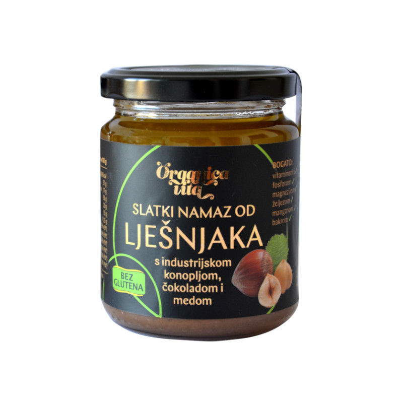 Bazu ovog slatkog namaza čine lješnjaci i oljuštene sjemenke konoplje, a finu slatkoću daju mu med i čokolada.